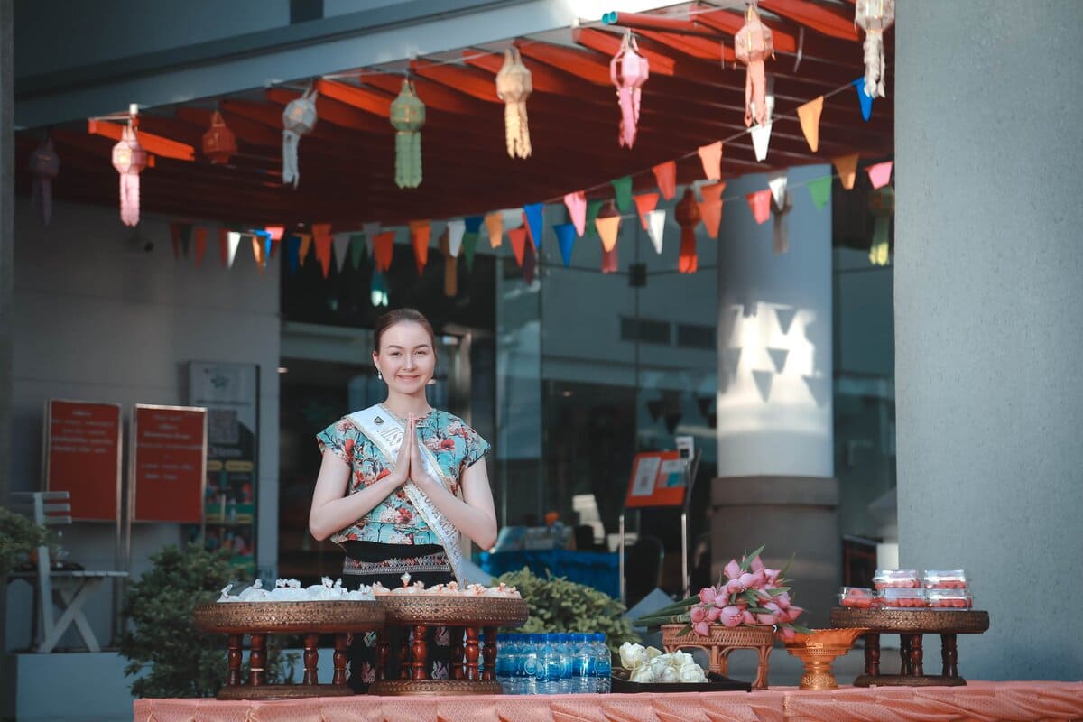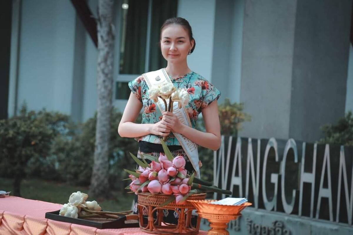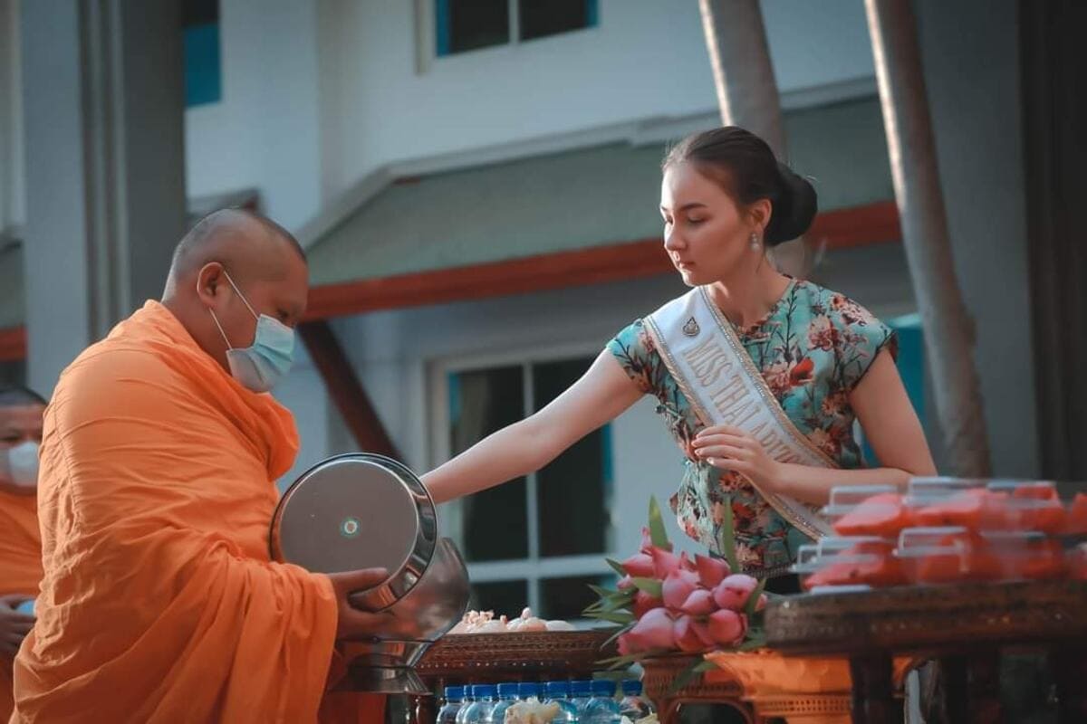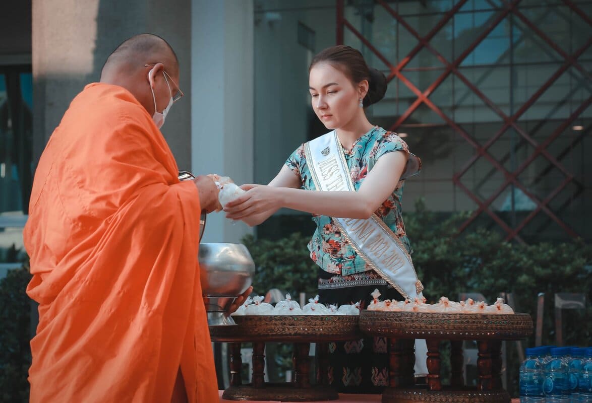 นางสาวไทยอริโซน่าใส่บาตรพระสงฆ์ตามวิถีของคนไทย ร่วมสร้างสะพานบุญ บริเวณหน้าล๊อบบี้ #มีบริการชุดใส่บาตรชุดละ 50 บาท #ตักบาตรสร้างสะานบุญรับอรุณเมืองสองแคว