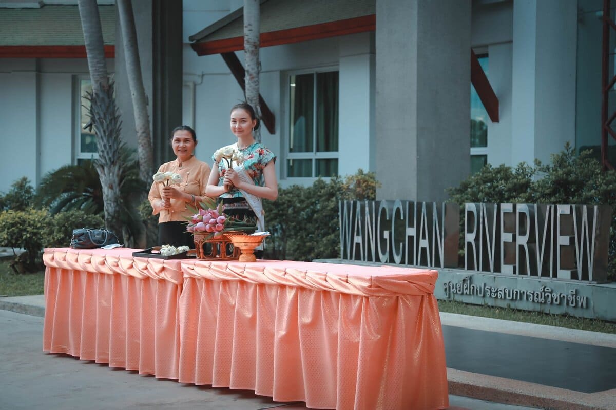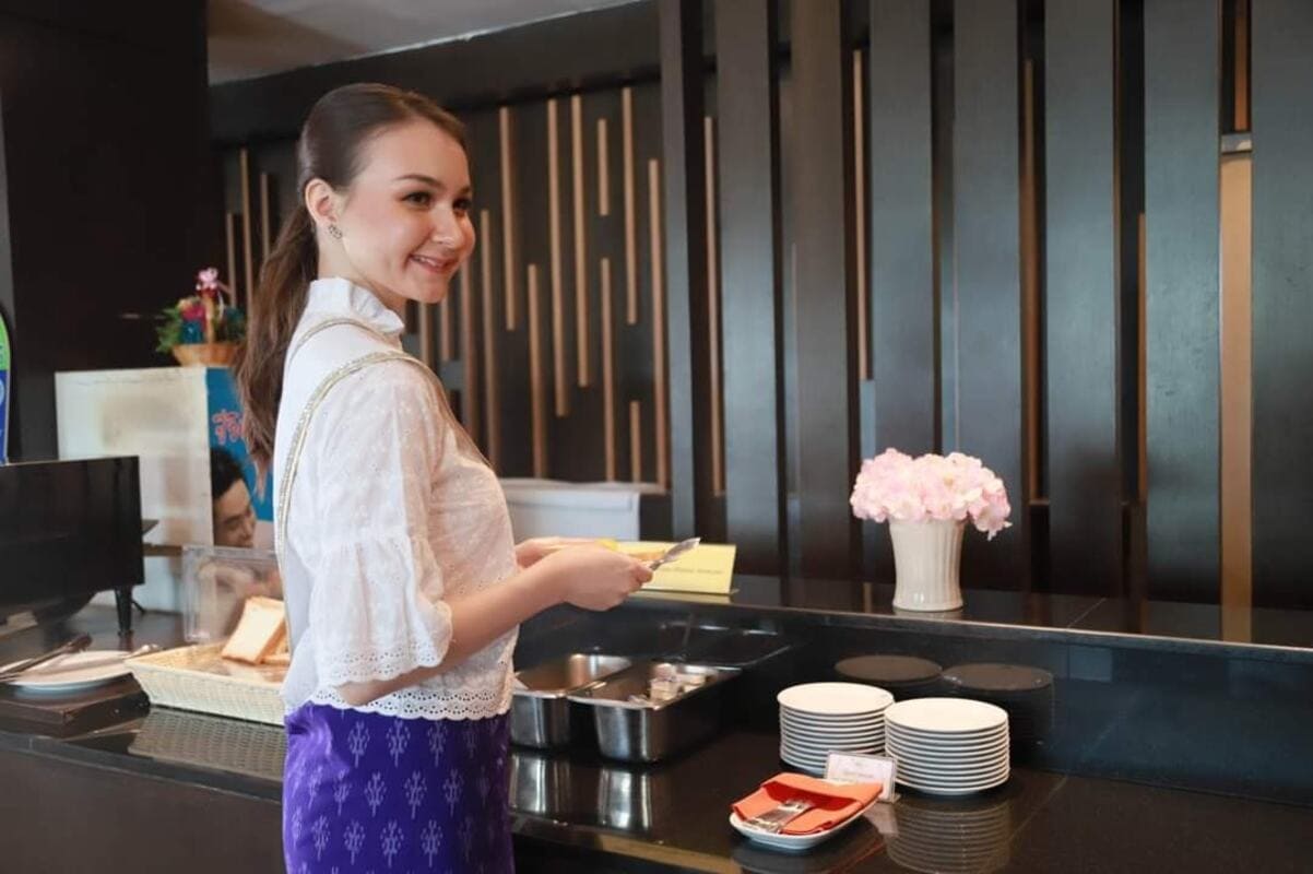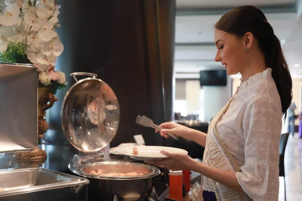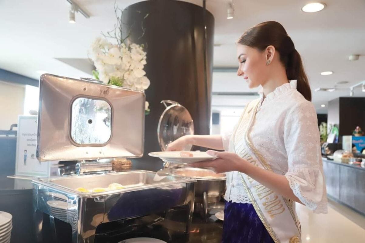 นางสาวไทยอริโซน่าใส่บาตรพระสงฆ์ตามวิถีของคนไทย ร่วมสร้างสะพานบุญ บริเวณหน้าล๊อบบี้ #มีบริการชุดใส่บาตรชุดละ 50 บาท #ตักบาตรสร้างสะานบุญรับอรุณเมืองสองแคว